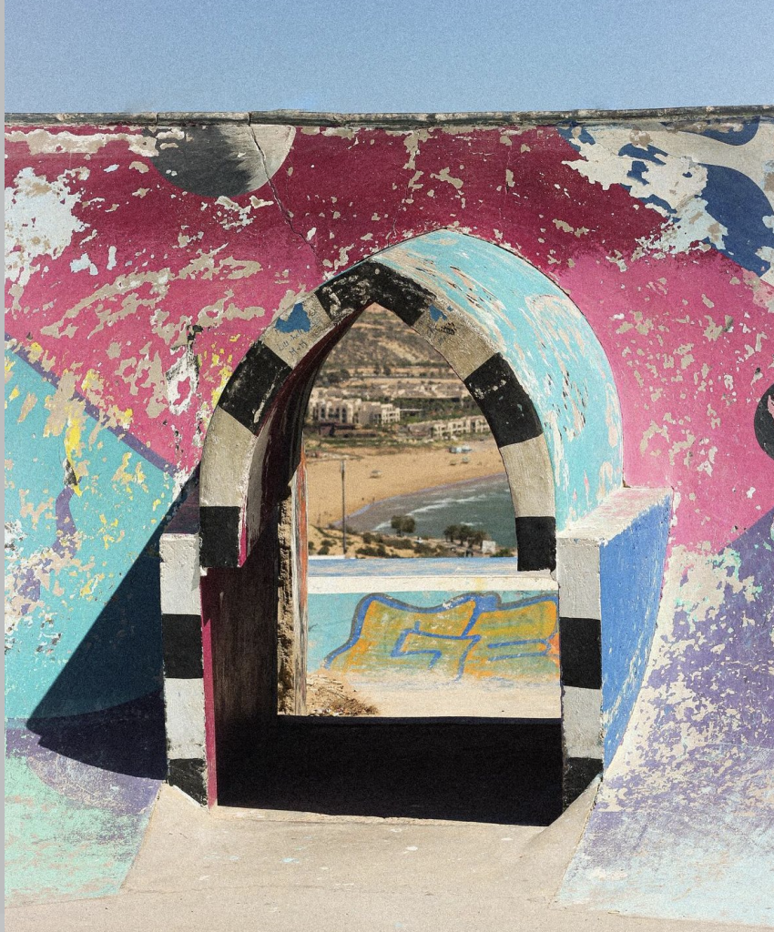 A change in routine, we passed on yoga and climbed the steep slope just opposite Surf Berbere, guided by blue arrows towards the summit. Zig-zagging, catching glimpses of the endless horizon behind us, we made it to Taghazout’s skatepark – a concrete jungle, tattooed with art from the local community who helped build the park itself. Wheels roaring, the park comes alive each evening from 5pm, with the locals putting on a display. Golden hues danced on each skater as the sun slowly met the horizon; a few hours blurred into one, and we left with precious new connections made, retracing our footsteps – following our noses to the dinner table.